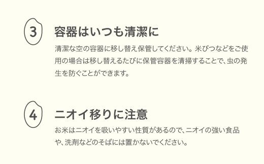 お米はニオイを吸いやすい性質があるため、ニオイの強いものと一緒に保管しないようご注意ください。