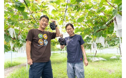 ぶどう農園がある東広島市高屋町は標高が高く、朝夜の寒暖差があることで、ぶどうの着色が進み、糖度が上がりやすい環境にあります。「たかやのぶどう」は2013年、25アール11品種のぶどう栽培を夫婦でスタートしました。現在は、50アールの畑で収穫時期が少しずつ違う16品種のブドウを栽培しています。8月から9月の収穫時期になると、毎朝5時にぶどう園へ行き、ずっしり重いぶどうを一房ずつ摘み取っていきます。午前中に検品や梱包を済ませ、午後から発送。朝採れぶどうはこうして全国へ届けられています。ぶどうの品種が違えば味が大きく違い、樹の個性も違います。それぞれに適した方法を模索しながらの栽培は、苦労もありますが面白さも尽きません。手塩にかけて育てた「シャインマスカット」を、ぜひ味わってください。