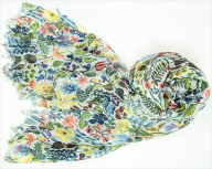 彩り豊かな植物柄「ハーバリウム」ホワイトは、普段着にさらっと巻くだけでコーディネートをポップで華やかな印象に。大判サイズなのでスタンダートに巻いたり、オシャレなミラノ巻きも出来たり、また、生地がとても薄いので三角形にしてアフガン巻きや肩口に羽織ったりなどいろいろな使い方ができる万能サイズになっております。