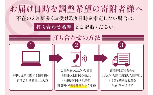 ご寄附いただいた翌日以降(翌日が土日祝日の場合、休日後の平日以降(※2))に事業者(養老軒)様へ直接お電話(※3)していただき、配送の打ち合わせをお願いいたします。