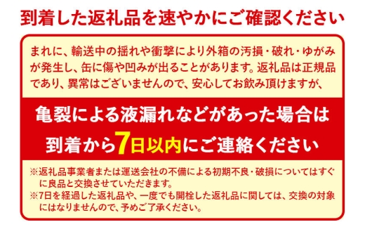 まれに、輸送中の揺れや衝撃により外箱の汚損・破れ・ゆがみが発生し、缶に傷や凹みが出ることがあります。返礼品は正規品であり、異常はございませんので、安心してお飲み頂けますが、亀裂による液漏れなどがあった場合は、返礼品到着から7日以内にご連絡ください。