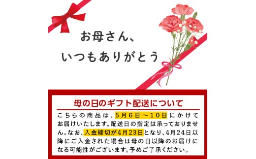 ※入金の締切が4月23日(木)となり、4月24日(金)以降にご入金された場合は母の日以降のお届けになる可能性がございます。予めご了承ください。