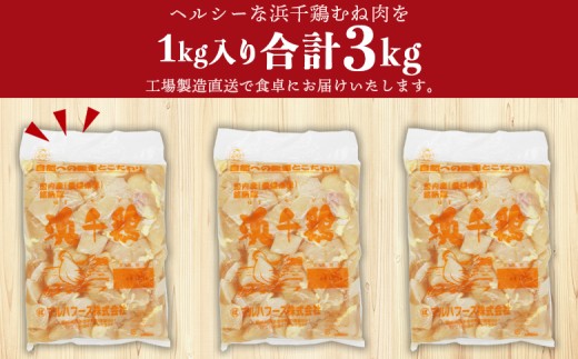 ヘルシーな浜千鶏むね肉をカットして、使いやすい1kgパックで合計3kg、
