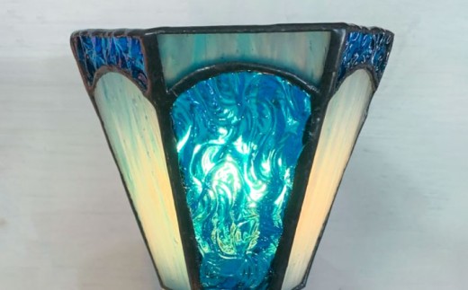 【受注生産】 おやすみ ランプ (六面体) ステンドグラス 水色 / 照明 ライト ランプ ステンドグラス / 大村市 / ステンドグラス工房ウォークオン [ACZT003]