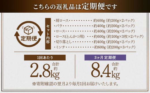 • HS-706 【3ヶ月定期便】鹿児島県産黒豚 6種詰合せ(約2.8kg×3回)
