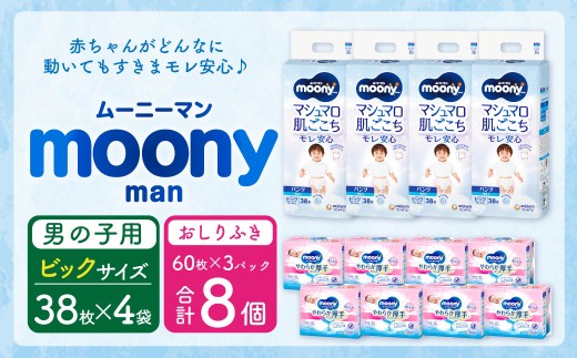 - ムーニーマン 男の子用 ビッグサイズ(38枚×4袋)・ムーニーおしりふきやわらか厚手詰替((60枚×3)×8パック)