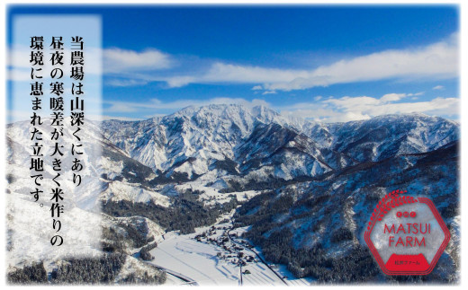 名峰・越後山脈に連なる桂山の麓で有機栽培・特別栽培米等の米作りに取り組む松井ファームの育てたお米。当農場は、南魚沼市の山深い五十沢地区に位置し、三国川のきれいな水、昼夜の寒暖差が大きく米作りの環境に恵まれた立地にあります。また、山々からの豊富な雪解け水は、お米の生育に重要なミネラルや栄養を与えてくれています。