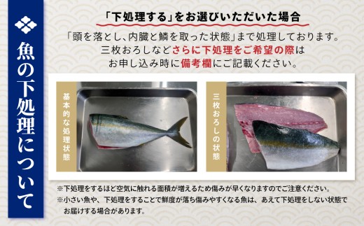 「下処理する」をお選びいただいた場合、「頭を落とし、内臓と鱗を取った状態」まで処理しております。三枚おろしなどさらに下処理をご希望の際はお申し込み時に備考欄にご記載ください。