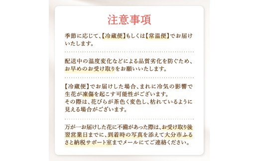 ・万が一お届けした花に不備があった際は、お受け取り後翌営業日までに、到着時の写真を添えて大分市ふるさと納税サポート室までご連絡くださいませ。