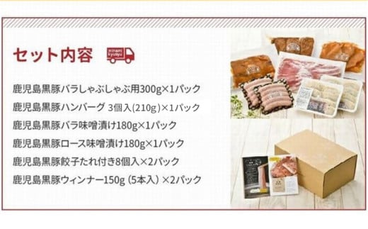 - 黒豚バラしゃぶしゃぶ用300g×1パック、黒豚ハンバーグ3個入(210g)×1パック、黒豚バラ味噌漬け180g×1パック