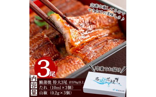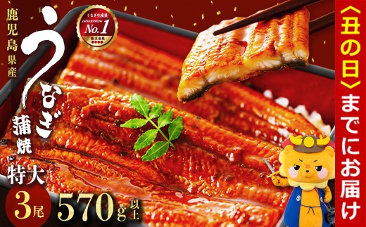 【丑の日までに配送】鹿児島県産うなぎ蒲焼 名水慈鰻 特大3尾(1尾190g以上)<計570g以上> うなぎ 鰻 ウナギ 3尾 国産 蒲焼 かばやき 冷凍 真空 真空パック 無頭 うな重 ひつまぶし タレ 山椒 b1-023-us