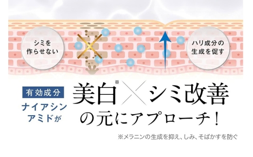 ・今、大注目!の有効成分「ナイアシンアミド」を厳選配合。有効成分がシミ、メラニン色素にアプローチし、美白×シワを改善します。