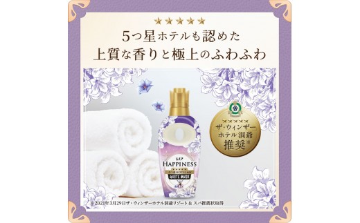 ホワイトムスクの香り。あたたかく香るムスクとさわやかなホワイトフローラルの香り。 5つ星ホテル推奨*。高級ホテルタオルのような、ふわふわシフォンにヨレ・毛玉も防ぐ*1汗をかいても防臭部屋干しOK*2赤ちゃん用衣類もやわらかく静電気を抑制 約4ヶ月分^1。65mL増やした新サイズ^2!*詳しくはウェブへ。