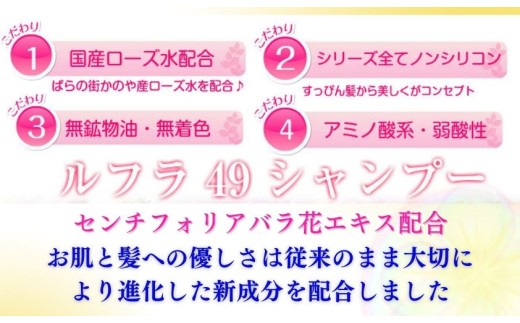RSシャンプールフラ49は<鹿児島県鹿屋産ダマスクローズ水配合>国産ローズシャンプーです 。