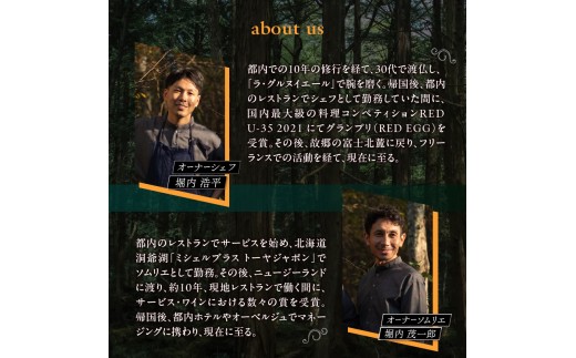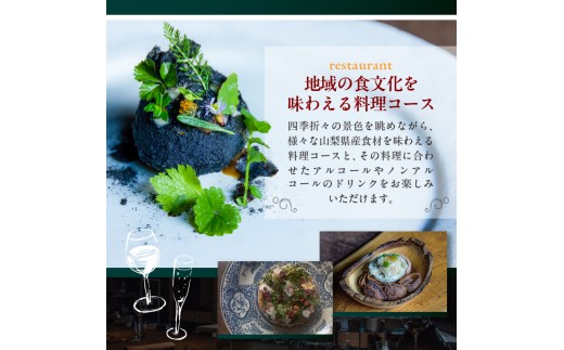シェフとソムリエの兄弟が、故郷で営むそのレストランでは、四季折々の景色を眺めながら、様々な山梨県産食材や、地域の食文化を味わえる料理コースと、その料理に合わせたアルコールやノンアルコールのドリンクをお楽しみいただけます。店内の装飾や備品類にも、周辺地域の要素がふんだんに盛り込まれていて、この土地の風土や食以外の文化も感じていただけると思います。
