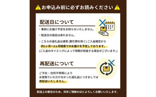 ご入金確定日から、1~2ヶ月程で発送させていただきます。但し、12月~1月にご寄附をいただいた場合は、最大4ヶ月程度かかる場合がございます。何卒、ご了承ください。 ※返礼品の配送に関して日付指定はお受けできませんのでご注意ください。