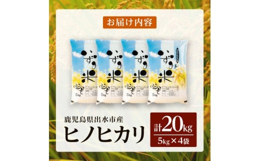 i1079-C <令和7年産 新米>鹿児島県 出水市産 ヒノヒカリ (計20kg・5kg×4袋) 米 20kg ひのひかりヒノヒカリ 鹿児島 20キロ お米 九州 九州産 甘み あっさり もちもち 新米 【いずみキッチン】