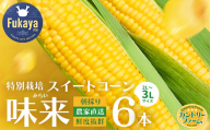 ◆◆深谷ねぎだけじゃない!農家直送深谷市産とうもろこし!◆◆ 深谷ねぎをはじめ、各種生鮮野菜の生産を行う「六次産業協同組合」。 野菜のエキスパートが育てた農家直送深谷市産とうもろこしです! 深谷市の夏の特産品と言えば「とうもろこし」です。 その中から、ジューシーなスイートコーンの一種「味来」をお届けいたします。 質のよい甘さと、穂の全体に並んだ黄金色の粒、そのひとつひとつがツヤツヤとして存在感があります。そして今までになかった粒皮のやわらかさが特徴です。 黄金色のとうもろこしは、栄養面にも非常に優れています! 疲労回復に効くアスパラギン酸をはじめ、脳を活性化するグルタミン酸、 免疫機能を高めるといわれるアラニンなど、注目の栄養成分を多く含みます。 野菜王国・深谷市産の農家直送とうもろこし! ぜひ新鮮でおいしい味来をご賞味ください! 【提供:六次産業協同組合】 【キャンセルにつきまして】  ふるさと納税は「寄附」となりますので、原則、キャンセル/返金対応をすることはできません。あらかじめご了承ください。  申込内容や返礼品の誤り、重複しての寄附等がないよう十分にご確認のうえ、ご寄附いただきますようお願いいたします。