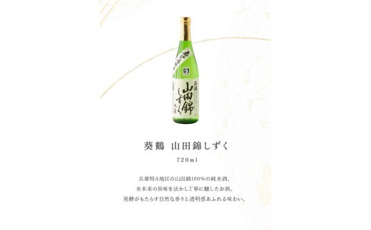 1. 葵鶴 山田錦しずく 720ml 「GIはりま」認定酒。兵庫県特A地区山田錦100%の純米酒です。もろみも十分溶かし、旨味ものっています。華やかな果実香と透明感溢れる味わいの、播磨の風土を活かしたお酒です。冷やしてお召し上がりください。  旨味ものっています。 2.葵鶴 原酒 720ml アルコール度数20度。もろみをしぼった後に水を加えないコクのある濃醇な酒。 ※20歳未満の飲酒は法律で禁止されています。