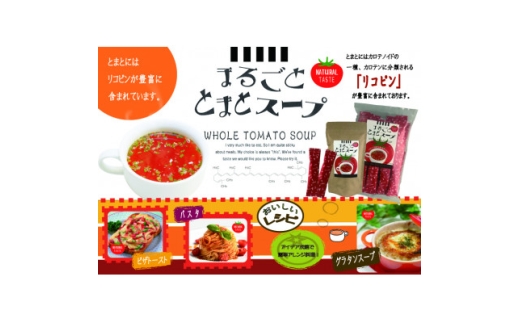 【まるごととまとスープ】食塩(国内製造)、グラニュー糖、乾燥トマト、オニオン、チキン風味シーズニング、乾燥パセリ/調味料(アミノ酸等)、酸味料、香料、(一部に小麦・大豆・鶏肉を含む)