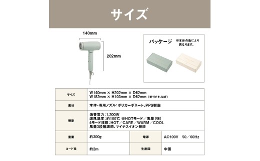 4モード搭載(HOT/CARE/WARM/COOL)、風量3段階調節、マイナスイオン機能