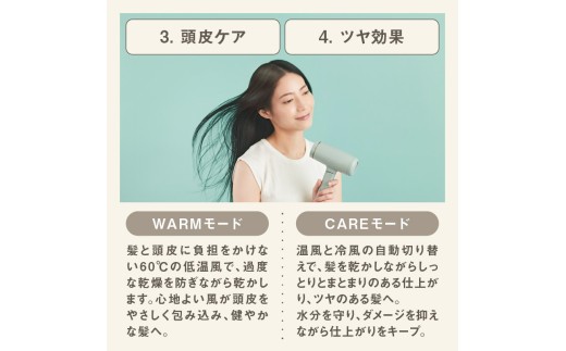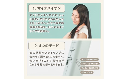 4モード搭載(HOT/CARE/WARM/COOL)、風量3段階調節、マイナスイオン機能