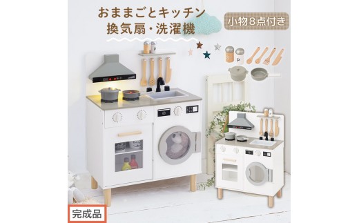 【完成品でお届け】ランドリー付きおままごとキッチン(ホワイト)おままごと キッチン コンパクト おもちゃキッチン ごっこ遊び 光る 音が鳴る 木製 小物セット おなべ フライパン 料理器具 EKANTC001655-0-WH