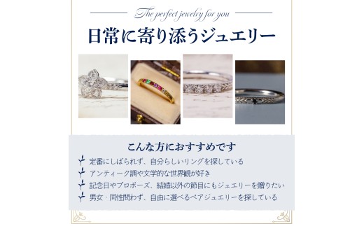 これらを組み合わせたリングは日常に寄り添うブライダルクオリティのジュエリーとして、特別な約束の場面はもちろん、自分へのご褒美や節目の記念にもふさわしいジュエリーです。