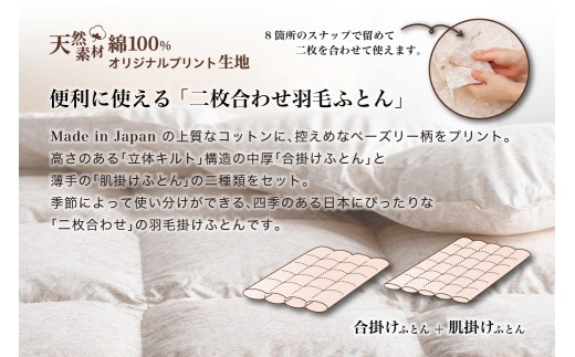 中厚の「合掛け」と薄手の「肌掛け(ダウンケット)」の二種類をセットにした、四季のある日本にぴったりな、ハンガリーホワイトグースの羽毛掛け布団です。