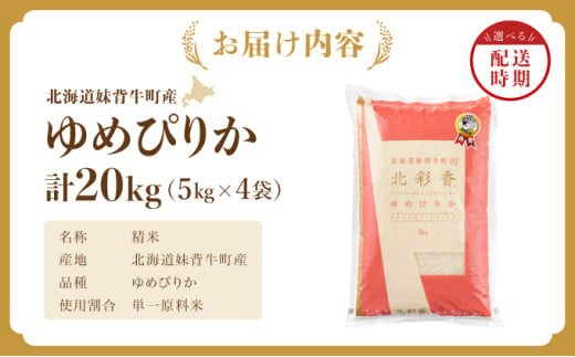 【令和7年産米】「北彩香(ゆめぴりか)」の白米20kg(5kg×4袋×1箱)をお届けします。 「ゆめぴりか」は全国の食味ランキング最高位「特A」評価のお米です。 産地直送のお米の味を確かめていただけます。