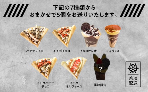 定番から変わり種まで、当店自慢の7種類のクレープの中から異なる5種類を厳選してお届けします。