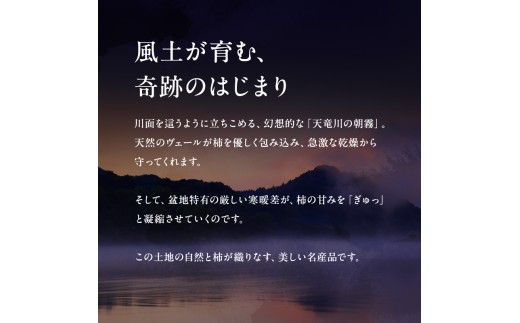 南信州の冬は乾燥する傾向であるため、天竜川から発生した霧が、干し柿を一気に乾燥させないように自然の加湿器となり、市田柿独特のもっちりとした食感を生み出しています。