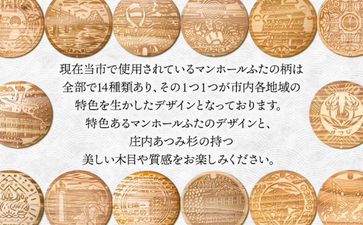 特色あるマンホールふたのデザインと、庄内あつみ杉の持つ美しい木目や質感をお楽しみください。