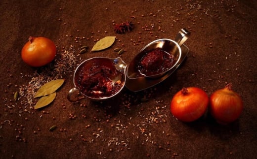長崎和牛骨と長崎対馬地鶏から取り出したスープに、長崎和牛・諌美豚を煮込み、余分な脂身やスジを外します。そして有機栽培玉ねぎを15kgから3kgになるまでじっくり低温でロースト。最後に20種類のオリジナルスパイスで仕上げます。これら全てを職人の手作業により、一週間かけて作りましたカレーは長きにわたり皆様に親しまれております。
