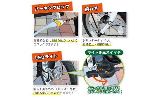 ●仕様:シングルギア、スイング機能、前カゴ、後ろカゴ、LEDライト、パーキングロック、前輪錠(スペアキー付)