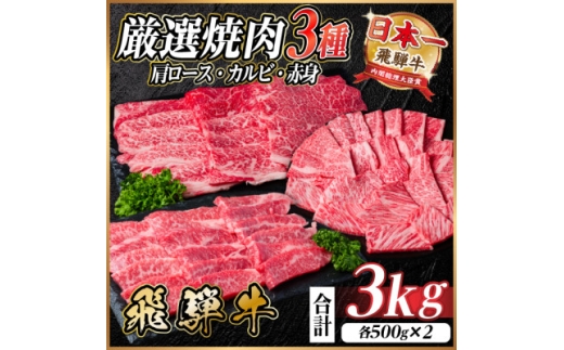 飛騨牛 厳選焼肉3種(肩ロース・カルビ・赤身) 計3kg(各500g×2) 黒毛和牛 小分け【1669125】