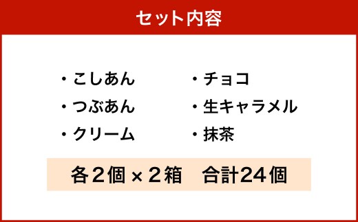 - 12個入り(こしあん、つぶあん、クリーム、チョコ、生キャラメル、抹茶 各2個)×2箱