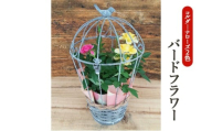 小鳥が止まり木にとまっている可愛いバスケットに、ミニバラをセットしました。