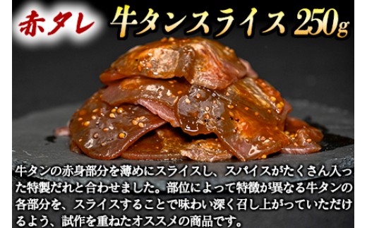 牛タンスライス(赤だれ):牛タンの赤身部分を薄めにスライスしスパイスがたくさん入ったたれと合わせました。