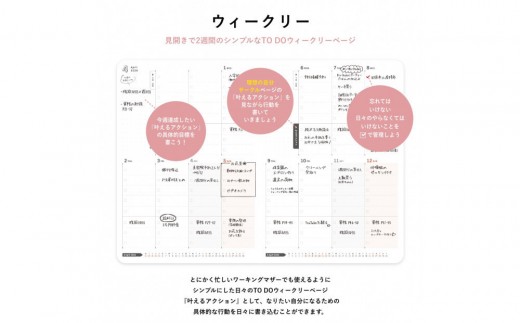 【内容】年間スケジュール、マンスリー(六曜あり・月齢あり)、家族スケジュール、家族年表、なりたい自分リスト、理想の自分サークル 、やらない事リスト、叶えるアクション欄付きウイークリー、メモ、ペンホルダー、しおり紐2本