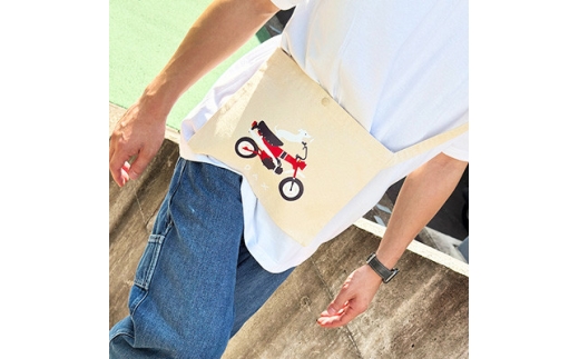 ホンダの人気ミニバイク「DAX(ダックス)」と、ユニークな「ダックスフント」の組み合わせを描いた、遊び心たっぷりのオリジナルサコッシュ。