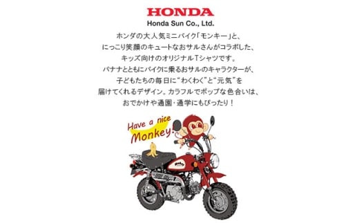 ホンダの大人気ミニバイク「モンキー」と、にっこり笑顔のキュートなおサルさんがコラボした、キッズ向けのオリジナルTシャツです。