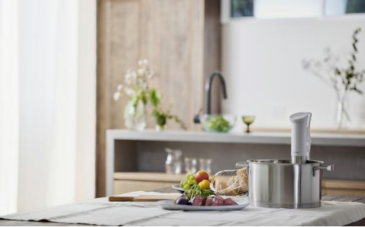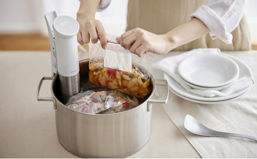 浅型の鍋(10cm以上から対応)でも使える、コンパクトでスリムな低温調理器です。