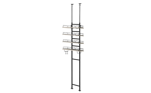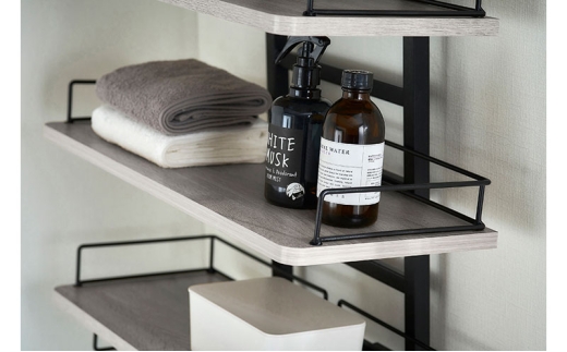 L字型のスチールガード付きで手前からは物を取りやすく、棚奥や横からは落ちにくい設計です。