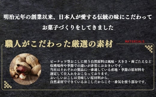◯ピーナッツ、クラッカー、柿の種、奉天等を糖蜜で絡め、独自の直釜製法で煎じて、スナック感覚でお召し上がり頂けます。