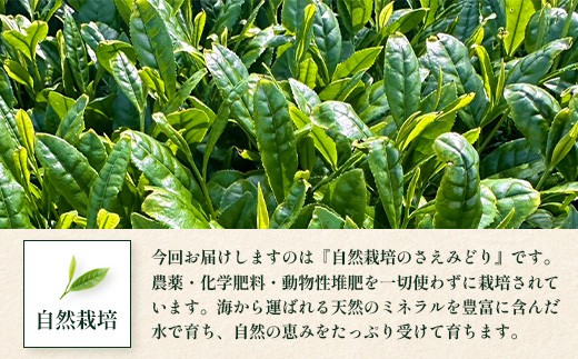 こちらのさえみどりは農薬、化学肥料、動物性堆肥を一切使っていないため、自然と身体に優しい自然栽培のお茶です。