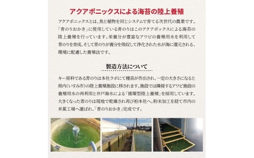 小林海苔店のラボで培養した青のりを県内で陸上養殖し、収穫した青のりを市内の米菓工場で加工しおかきにしています。カリっとしたおかきの食感と、磯の香りが豊かな青のりの風味が絶妙です。