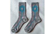スキップしたくなるようなくつしたをつくりたくて図案を描きました。 綿の糸と、不規則な綿スラブ糸を使い立体感を感じられるジャガード編みで図案を表現しています。