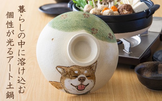 暮らしの美術品 絵付けアーティストの個性が光るHandmade土鍋。絵付けART工房・平尾製陶 土鍋8号「しあわせワンコ柴犬」【手描き、土鍋、ハンドメイド、アート、デザイン、鍋、 家庭用、3人用、4人用、3人前、4人前、家族、冬、煮込み、手 芸、工芸、三重県、四日市市、ふるさと納税】
