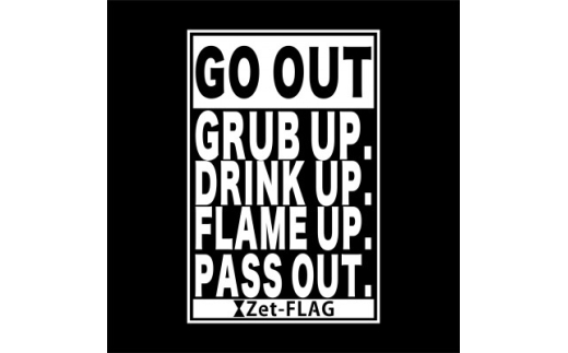 「GO OUT / GRUB UP. / DRINK UP. / FLAME UP. / PASS OUT.」というメッセージを大胆に刻み、